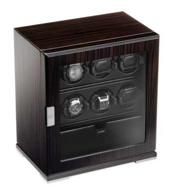 Zebrano wood case with one crystal glass door. Wind up to 6 automatic big size watches with one drawer for 2 leather or bracelet strap watches and a vacant space to be used at one’s discretion. Zebrano wood outside, leather and pure jacquard silk inside. Programmable, operates on batteries or with a 6 Volt DC adapter included. 10 rotating programs.