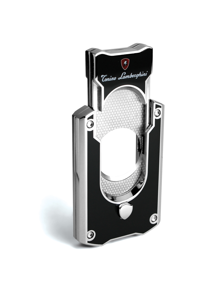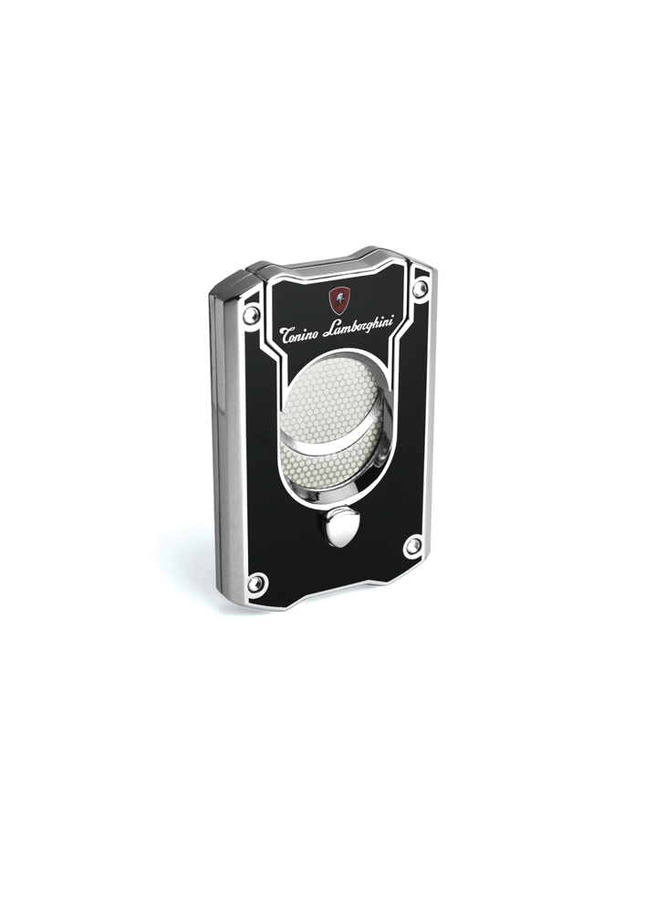 Sleekly trim your cigars with a premium quality stainless steel Le Mans cigar cutter from iconic Italian brand Tonino Lamborghini. Dual guillotine blades allow precision cutting and silver tone polished front button releases top blade upward to accommodate cigars up to a 58 gauge. The Polished finish is available embossed with the honeycomb or interwoven  pattern, red, black, purple, brushed chrome, carbon fiber or red carbon fiber,  while corner bolt details and signature red Lamborghini logo add sophisticated finishing touches. Signature leather holder included.