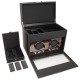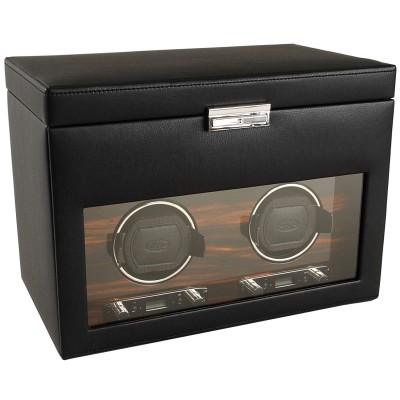 The Roadster Collection Watch Winders are constructed with a sturdy wooden frame in supple black pebble faux leather with an ebony macassar wood veneer faceplate. It features shiny chrome hardware, recessed metal hinges, chrome key lock closure, see-through tempered glass lid and operates on either 3.3V Adapter (included) or D- Cell batteries. The Module 2.7 Watch Winder provides turns per day options of 300-1200 turns per day rotating clockwise, counter-clockwise or bi-directional. The individual options of rotation and direction settings combine to offer 57 personal programming options. Additionally this Double Winder with Storage provides storage for up to three additional watches and a removable travel case for one watch storage.