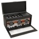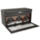 The Roadster Collection Watch Winders are constructed with a sturdy wooden frame in supple black pebble faux leather with an ebony macassar wood veneer faceplate. It features shiny chrome hardware, recessed metal hinges, chrome key lock closure, see-through tempered glass lid and operates on either 3.3V Adapter (included) or D- Cell batteries. The Module 2.7 Watch Winder provides turns per day options of 300-1200 turns per day rotating clockwise, counter-clockwise or bi-directional. The individual options of rotation and direction settings combine to offer 57 personal programming options. Additionally this Triple Winder provides storage for up to five additional watches and a removable travel case for one watch storage.