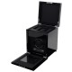 The Savoy Collection Watch Winders are constructed with a sturdy wooden frame, classic black piano exterior and a black textured silk faceplate. It features chrome plated hardware, recessed metal hinges, key lock closure, see-through tempered glass lid and operates on either 3.3V Adapter (included) or D- Cell batteries. The Module 2.7 Watch Winder provides turns per day options of 300-1200 turns per day rotating clockwise, counter-clockwise and bi-directional. The individual options of rotation and direction settings combine to offer 57 personal programming options. Additionally, this Single Winder provides storage for up to three additional watches.